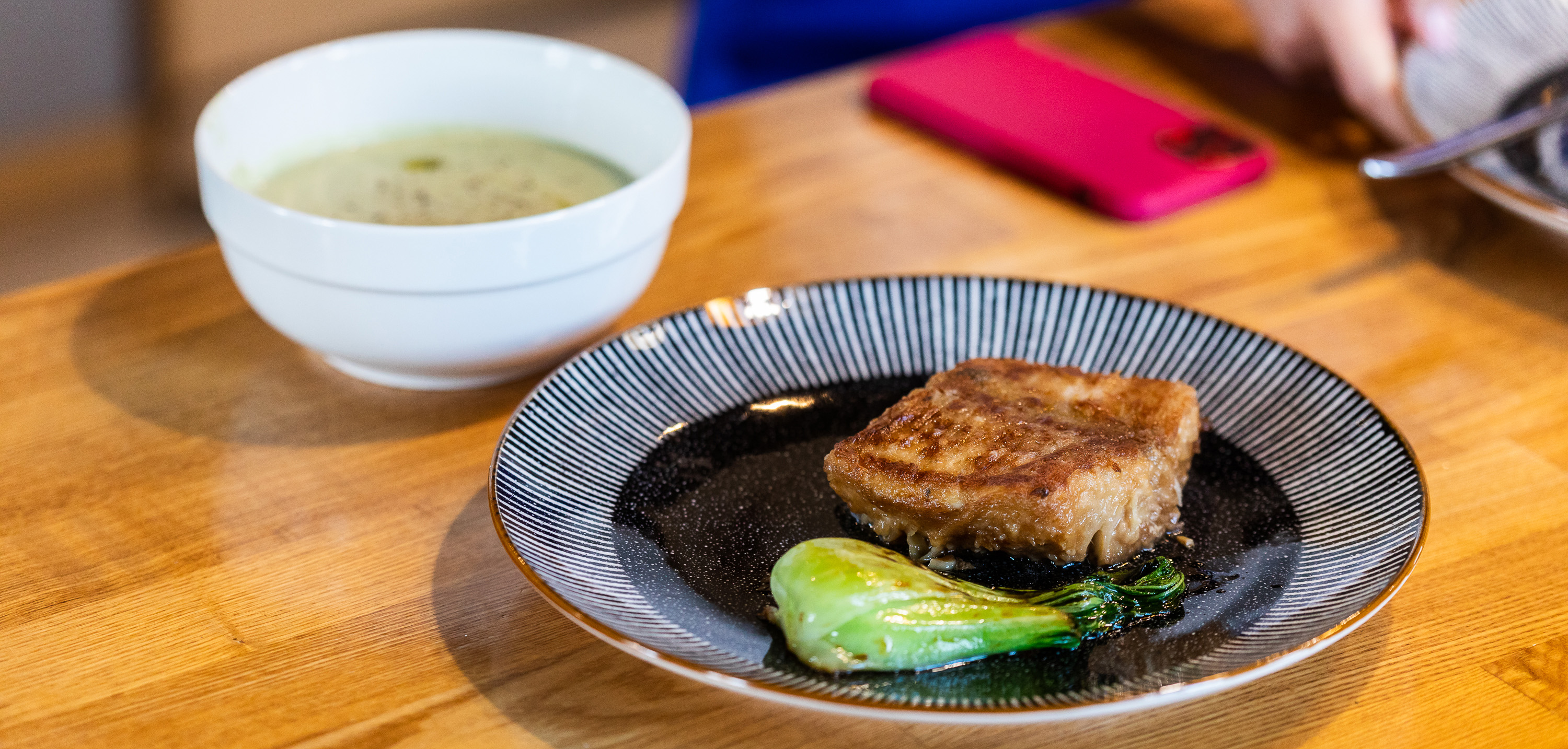 Много открытий ждало участников и на мастер-классе по «черной» треске. Эту рыбу уважают японцы за нежное белое мясо. Они готовят с нее свои знаменитые сашими. Гуру поварского дела подготовили два рецепта: суп-пюре и стейк с капустой пак-чой. Основной для супа послужили брокколи, репчатый лук и филе трески, а нежнейший вкус придала заправка из молока со сливками. Готовится все быстро и легко, но понадобится блендер, превратить суп в консистенцию пюре. В приготовлении же стейка из благородной трески оказывается все дело в маринаде из соевого соуса и меда. Именно это сочетание уже при жарке даст золотистую корочку и слегка сладковатый вкус. Ну а сочность стейка достигается за счет быстрой обжарки на сковородке с двух сторон и доведением до готовности уже в духовке. Подается рыбное филе с китайской капустой. Ее предварительно бланшируют в кипящей воде, а затем быстро обжаривают в маринаде из-под стейка с добавлением устричного соуса.