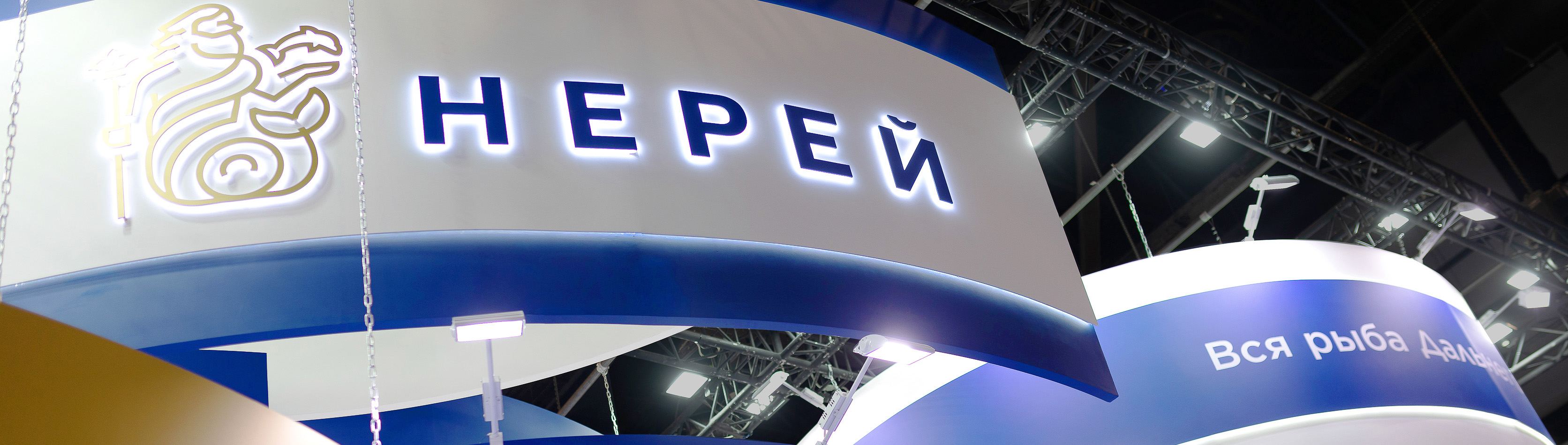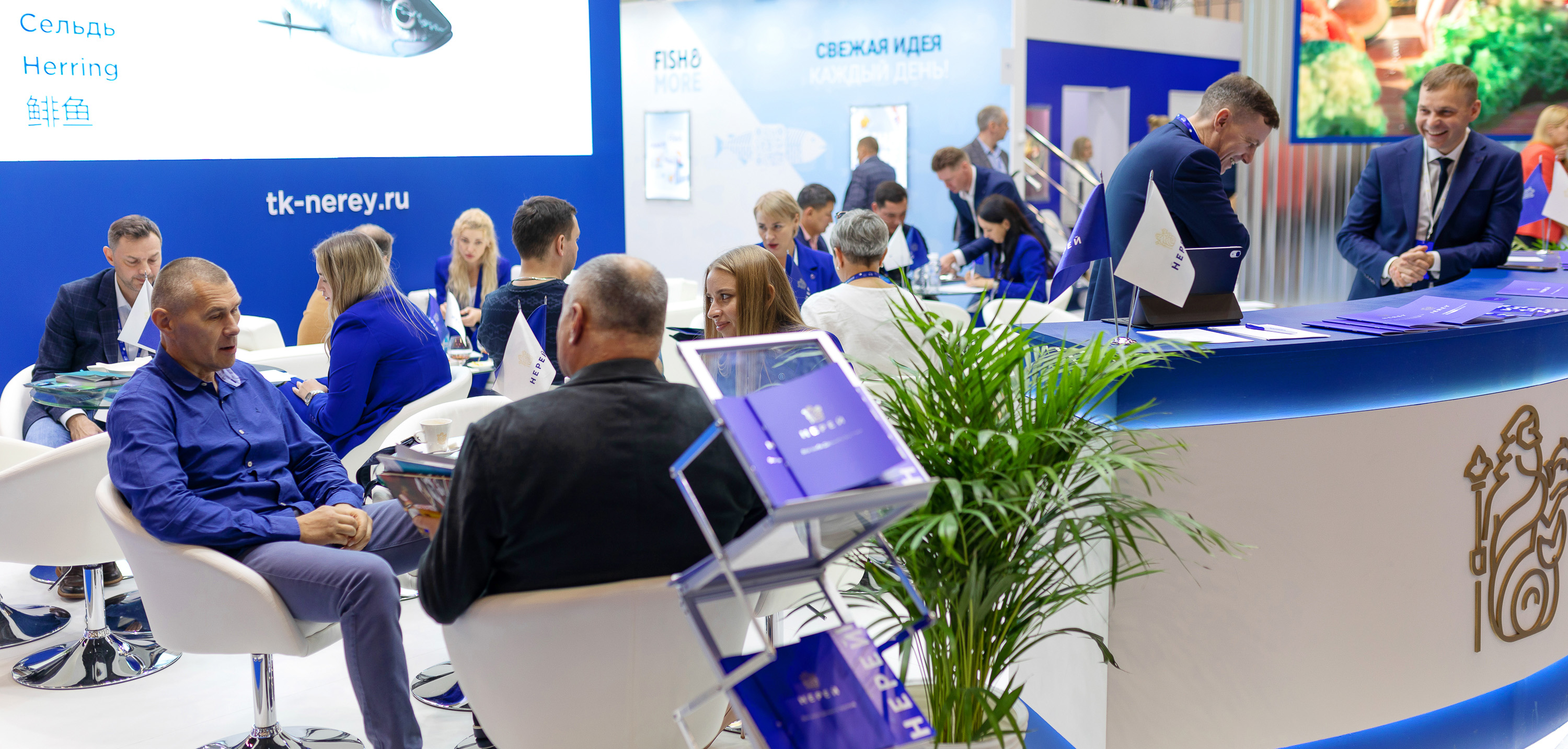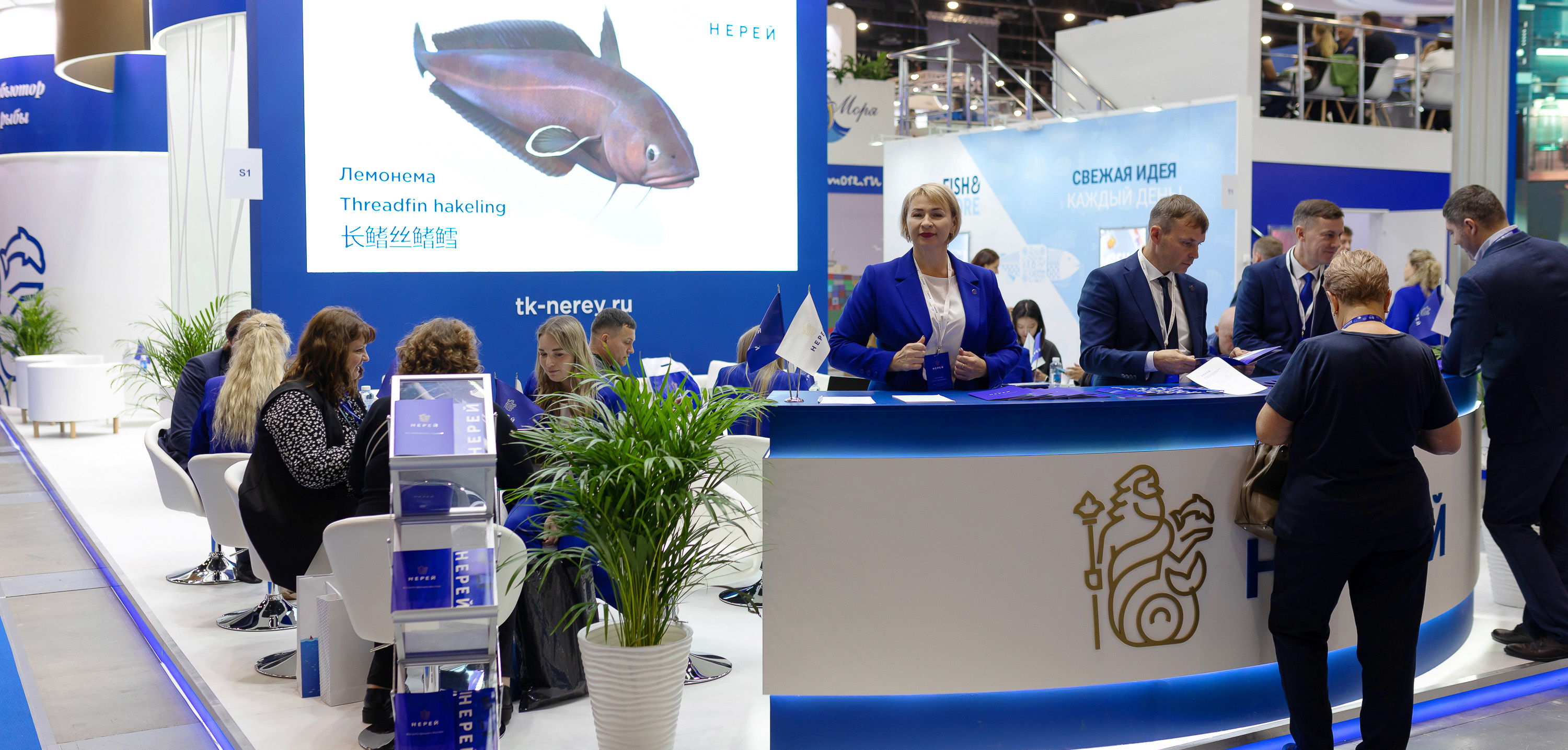 Компания «Нерей» к выставке готовилась основательно и тщательно. Почти год заняли подготовительные работы. С особым трепетом разрабатывался визуальный концепт для столь важного мероприятия. Нереевский стиль узнаваем и уникален, тем не мнее хотелось порадовать и удивить гостей выставки чем-то новым. Самые сильные впечатления произвел наш красивый стенд, который своими очертаниями и конструкцией напоминает многим огромный бело-синий корабль, где есть и палуба, и нос, и капитанский мостик. Светящаяся подвесная конструкция с логотипом и девизом компании просматривалась со всех точек выставочного зала. Точкой притяжения стали и наши анимированные рыбы на большом экране. Их снимали на камеры, с ними фотографировались, ими просто любовались, повторяя одну фразу, ну как живые!
