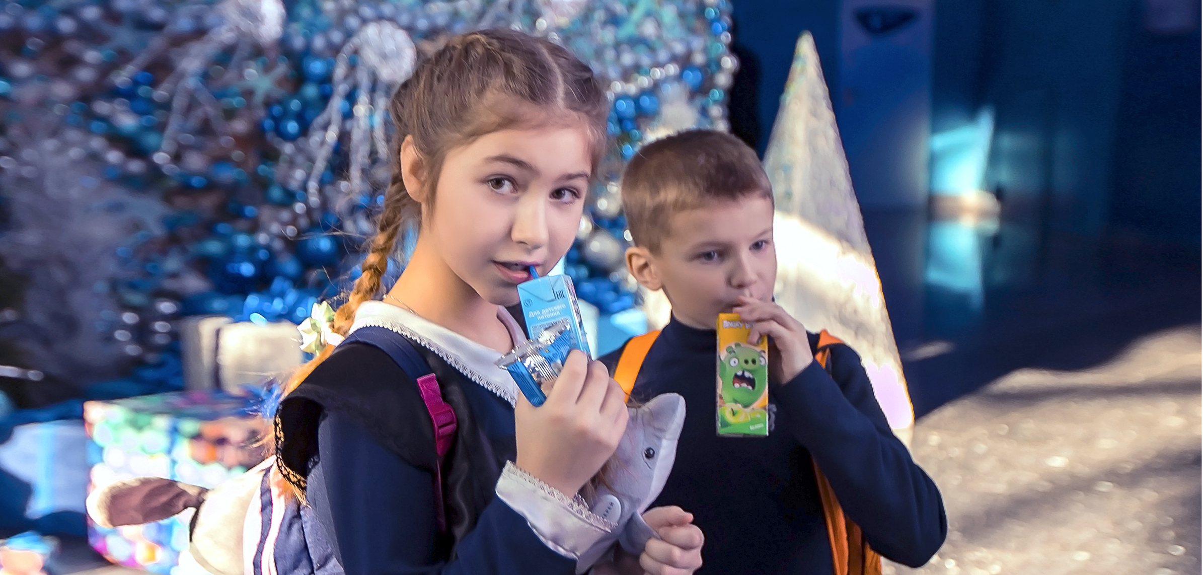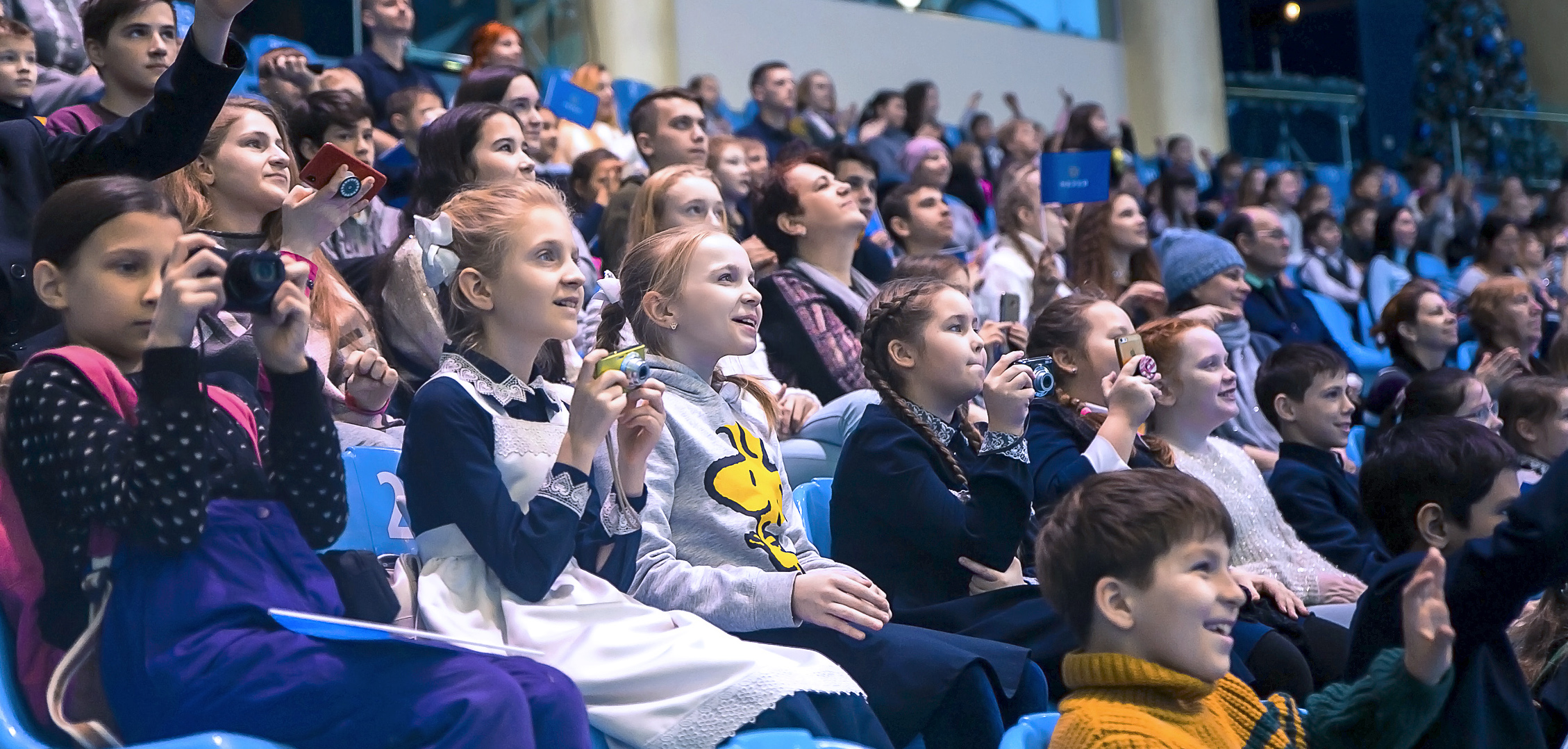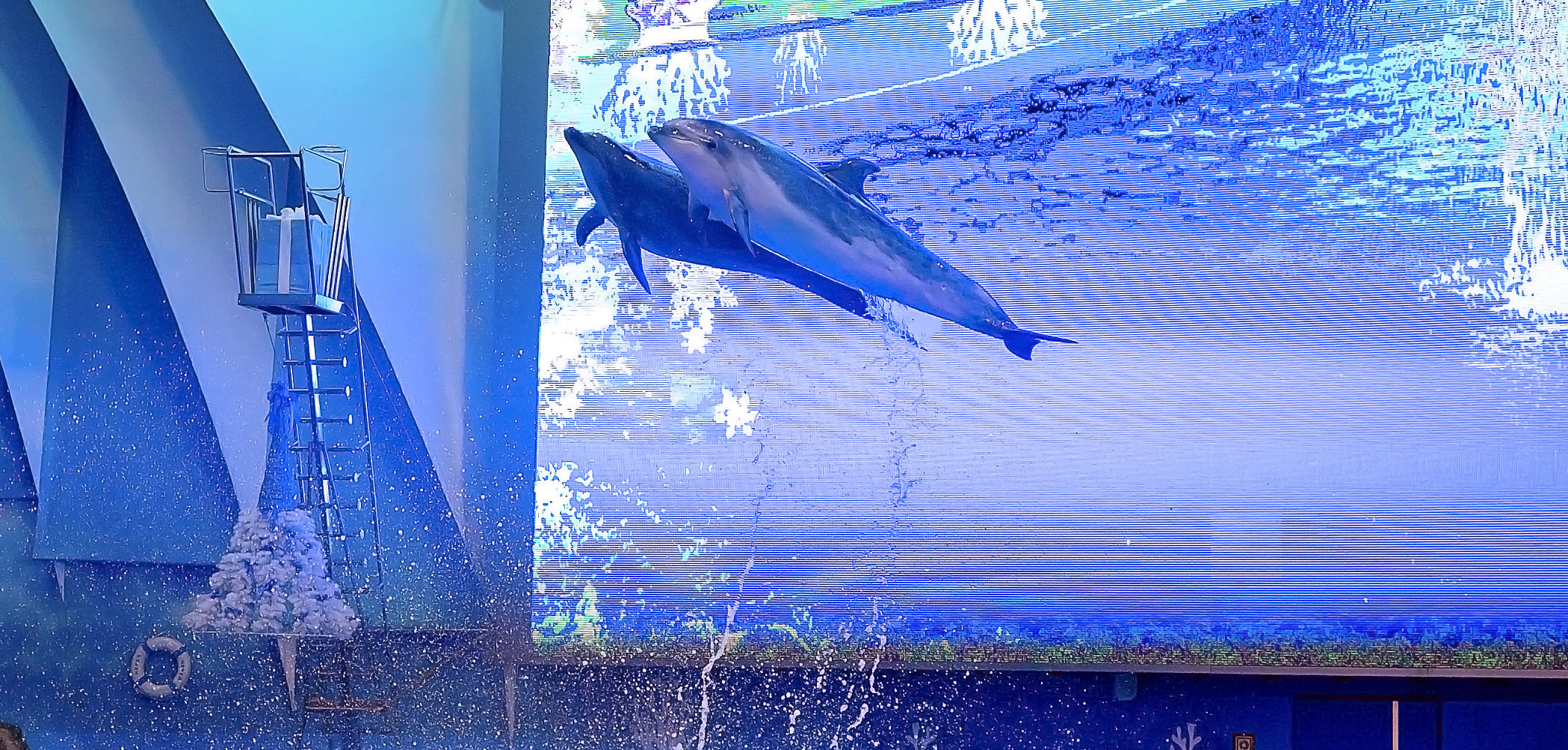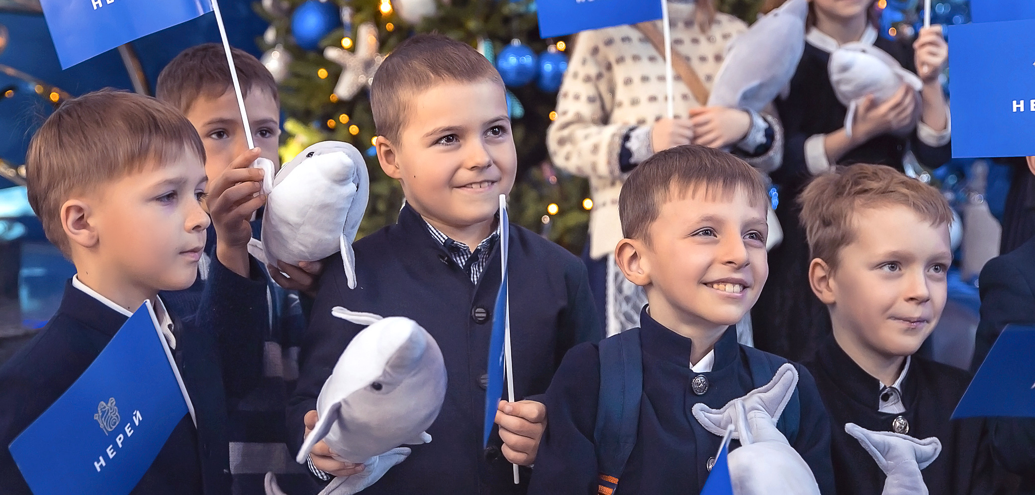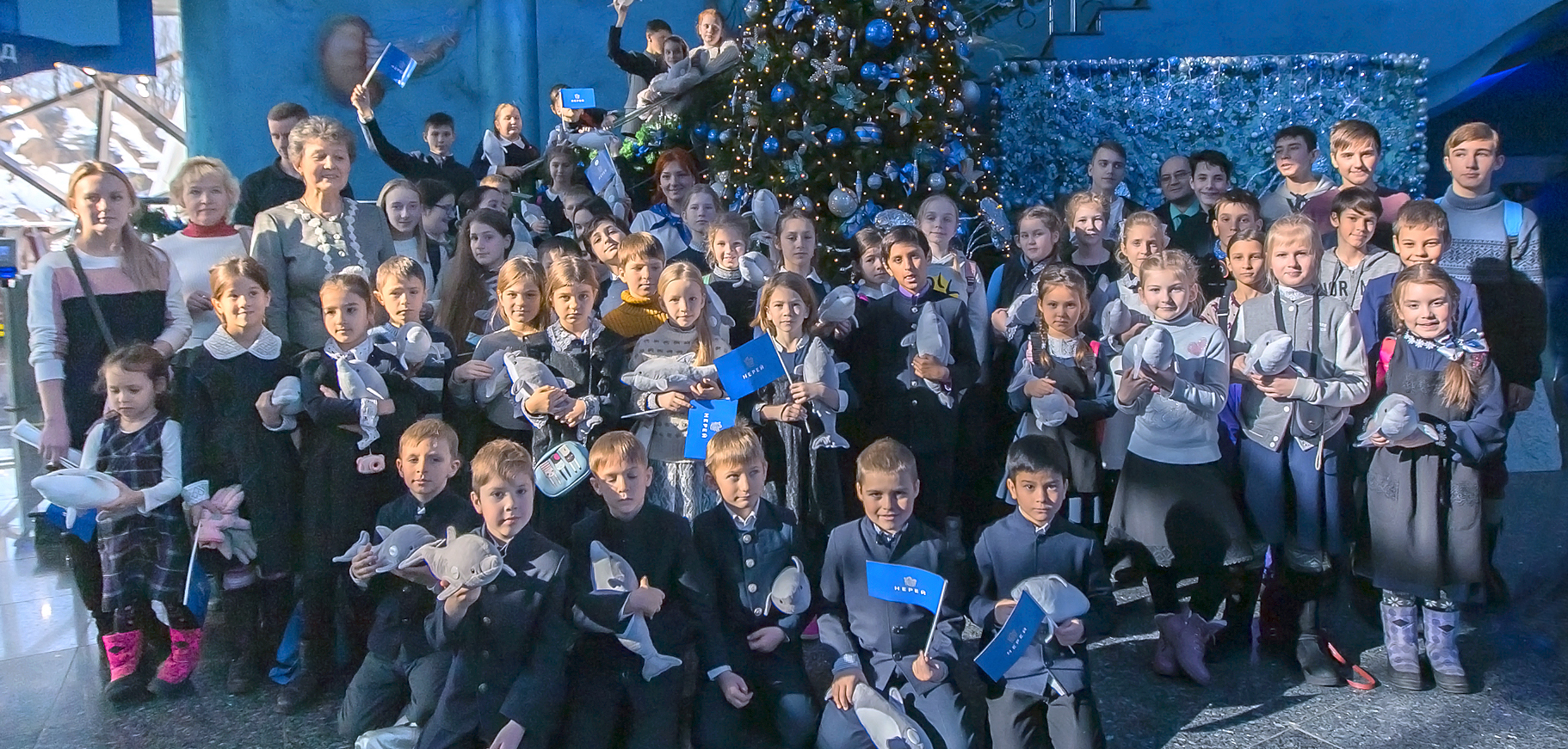 Новая новогодняя программа в дельфинарии вызвала целую бурю детских эмоций! Наши любимые артисты - изящные, умные дельфины танцевали, пели, выполняли сложные акробатические трюки. Дети с замиранием сердца наблюдали, как синхронно, высоко над поверхностью воды взмывают в воздух эти довольно массивные и такие удивительные морские млекопитающие. А мы не могли сдержать восторга, когда видели детские улыбки и счастливые лица наших ста детей на большом экране дельфинария! Выступление дельфинов было волшебным и безукоризненным. А вот морж Миша в этот раз немного продемонстрировал свой характер - он решил, что вместо того, чтобы выполнять команды тренера, ему лучше просто поплавать в бассейне, зато сделать это величаво и грациозно! Впрочем, это нисколько не расстроило детей, а даже наоборот: Миша настоящая личность, звезда с характером, его принимают и обожают именно таким! Дети были счастливы, и мы вместе с ними.