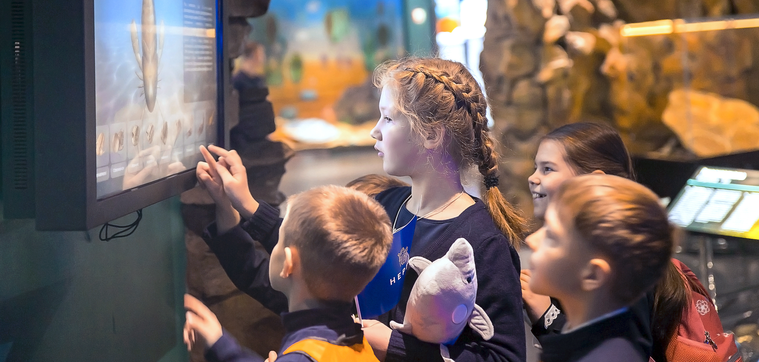 Когда настало время экскурсии, сотрудники Океанариума разделили участников на три большие группы. Для каждой был предусмотрен свой маршрут и программа, соответствующая возрасту наших гимназистов. Затем вместе с опытными гидами дети отправились в настоящее путешествие во времени. Они увидели то, как зарождалась жизнь на нашей планете и узнали, откуда на Земле появились первые млекопитающие. Дети были потрясены тем, какой невероятной величины создания обитали под толщей воды! Одно дело, читать об этом, и совсем другое - видеть своими глазами: макеты гигантских существ - древних китообразных, плезиозавра, воссозданных в натуральную величину, участники наблюдали с неподдельным удивлением и восхищением в глазах!
